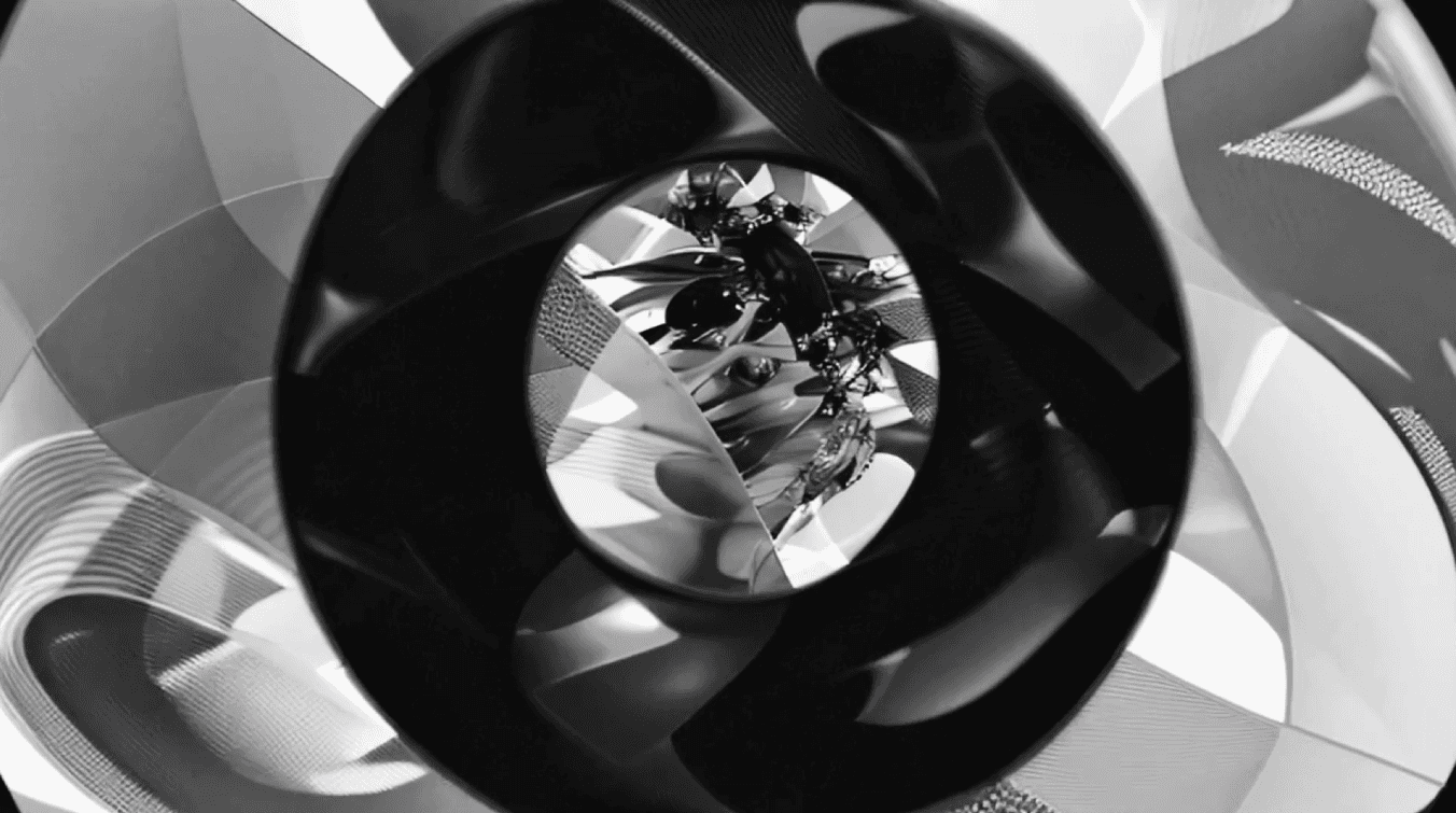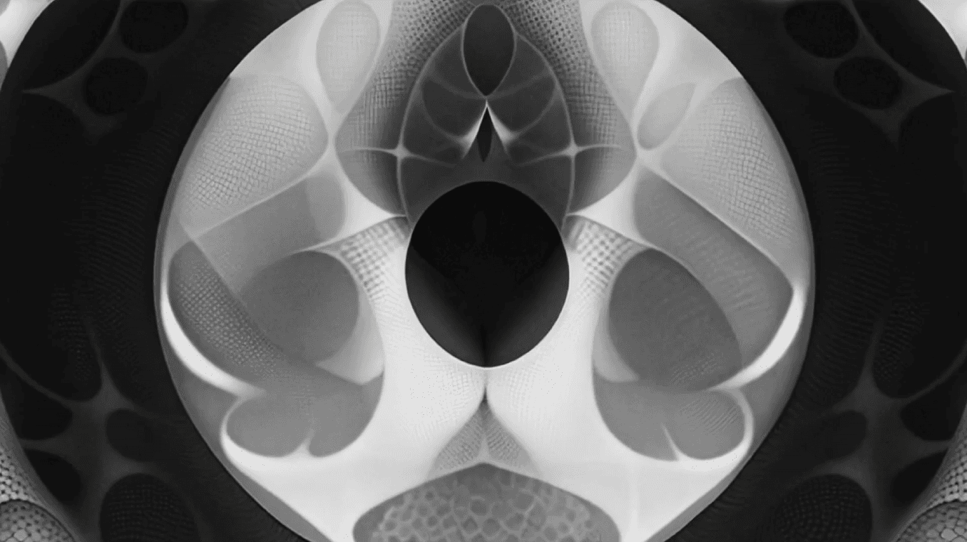 Black-and-white abstract animation built around dimensional circular forms scaling and emerging from the center of the frame. Continuous growth, morphing shapes, and ambient motion create a meditative, evolving visual structure.