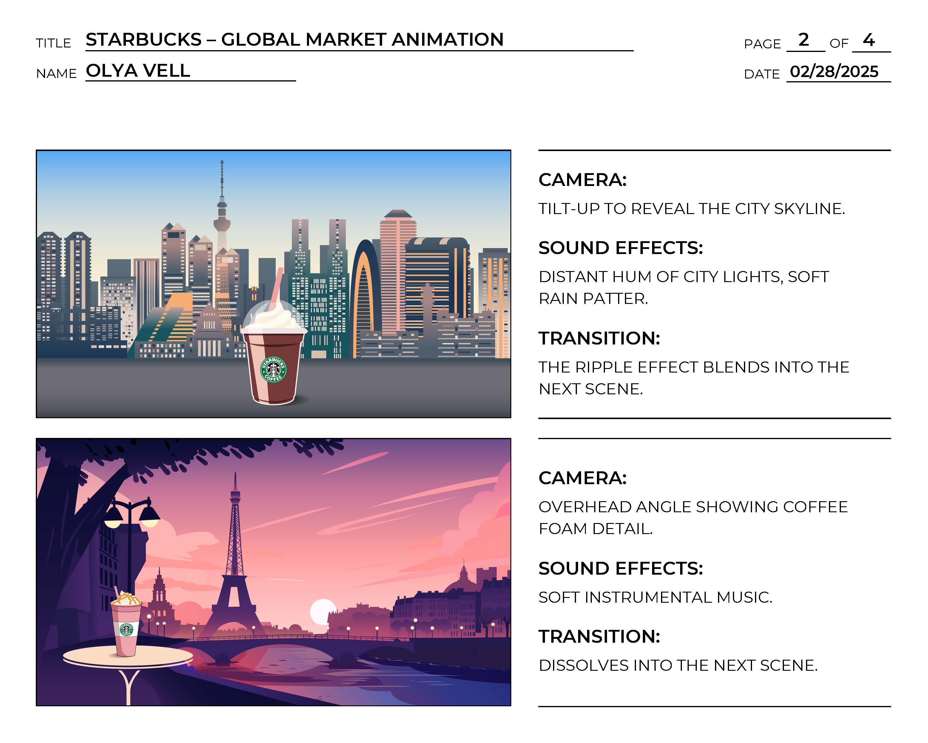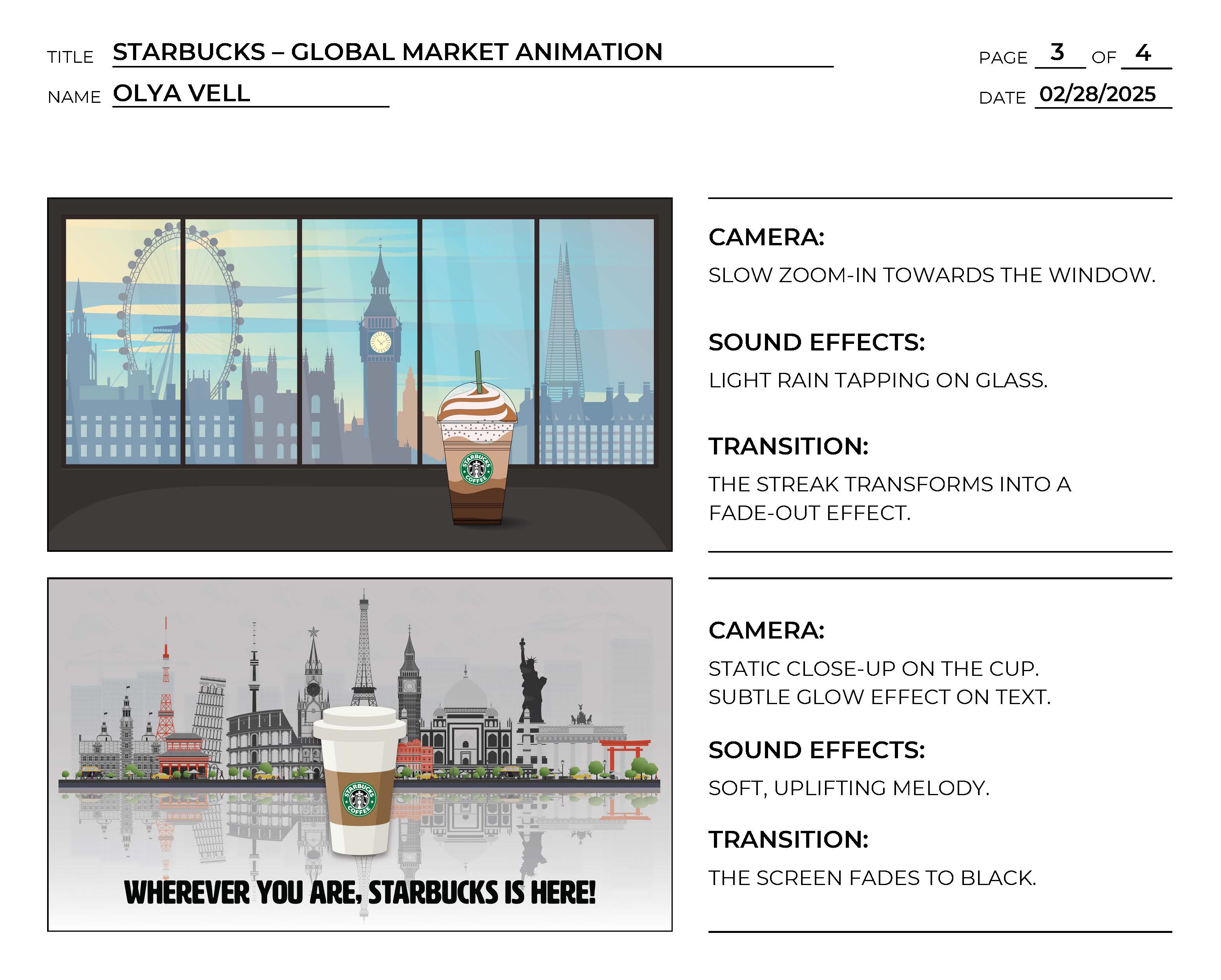 Starbucks seeks a motion design studio to create a dynamic promotional animation that showcases the global presence and comforting experience of the brand. The animation should emphasize that Starbucks, through its global market, is always there for customers around the world, offering a comforting and soothing cup of their favorite drink, no matter the weather, location, or situation. It will highlight how Starbucks’ services, quality, and supplies are accessible to everyone, providing a familiar and reliable experience in every corner of the world.